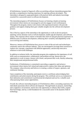 jclicksolutions in Nagercoil offers a comprehensive software internship program aimed at aspiring developers, providing practical skills and industry knowledge. Interns engage in hands-on projects across various domains and receive mentorship from experienced professionals, fostering both technical and soft skills. Upon completion, participants earn a certificate that highlights their contributions and can aid in future career pursuits.