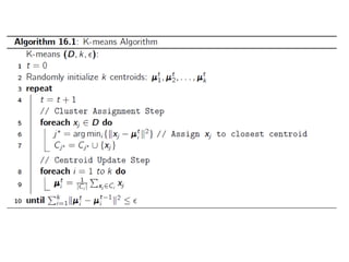 The document outlines the application of MapReduce to k-means clustering, detailing the process of assigning initial cluster centers, iteratively updating clusters, and finalizing the output. It discusses the Expectation-Maximization (EM) algorithm for parameter estimation in probabilistic models, highlighting the steps involved in maximizing the log-likelihood through iterative calculations. Additionally, the document introduces concepts related to probabilistic latent semantic analysis (PLSA), emphasizing the generative process for documents and terms using latent variables.