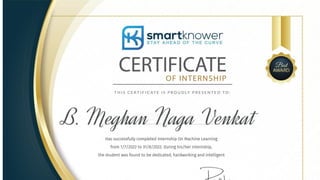 The document discusses an internship focused on machine learning with Python, coordinated by smartknower, an AI-driven e-learning platform founded by P. Naveen. It outlines the importance and applications of machine learning, different types of learning methods, and emphasizes Python's advantages for machine learning projects. The document concludes by highlighting the growing significance of machine learning in various fields and its potential for future developments.
