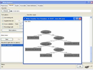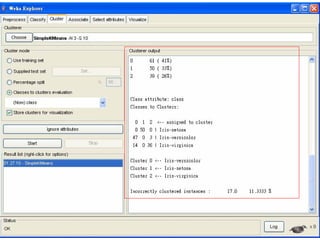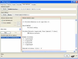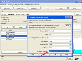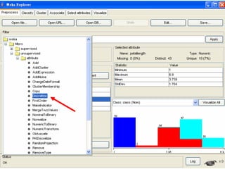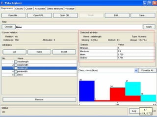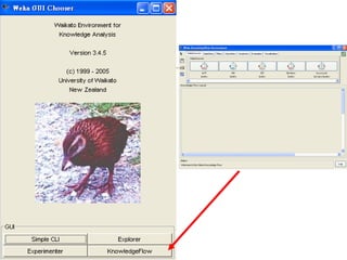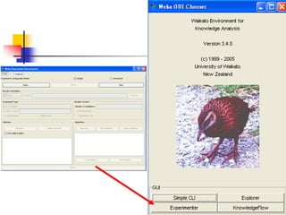 This document provides an overview of the machine learning workbench WEKA. It describes how WEKA can be used to import and preprocess data, build classifiers and clustering models, perform attribute selection and data visualization, and run experiments. Key capabilities mentioned include importing data from various formats, using filters for preprocessing, implementing various learning algorithms like decision trees and SVMs, clustering algorithms, association rule learning, attribute selection methods, and the experimenter for comparing models. The Knowledge Flow GUI is also introduced as a graphical interface in WEKA.