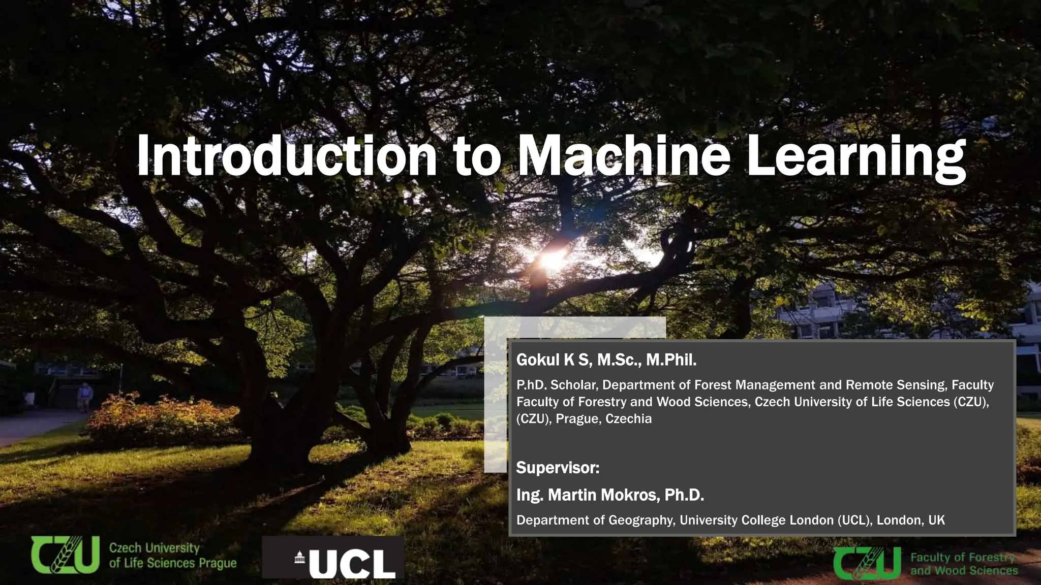 The document provides an overview of artificial intelligence (AI) and its subset, machine learning (ML), highlighting various types of learning including supervised, unsupervised, and reinforcement learning. It details the algorithms used in each category, offers applications of ML in forestry, and discusses issues in machine learning such as biases and data quality. The author, Gokul K.S., is a PhD scholar at the Czech University of Life Sciences, with guidance from a supervisor at University College London.