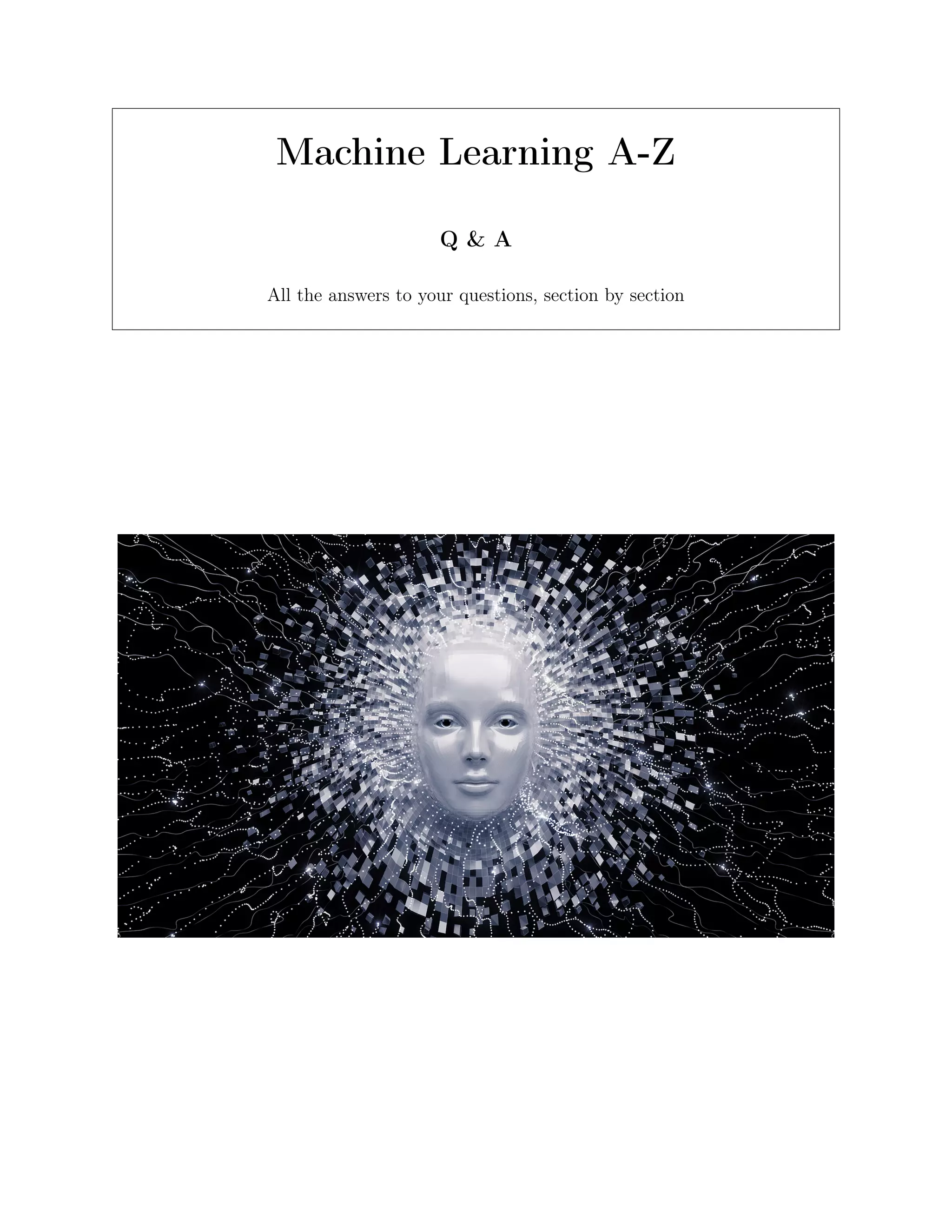 This document provides an overview and reference for machine learning algorithms. It includes sections on data preprocessing, regression, classification, clustering, association rule learning, and reinforcement learning. For each algorithm, it provides intuition, examples of implementation in Python and R, and references for further reading. The document serves as a question and answer guide for machine learning practitioners.
