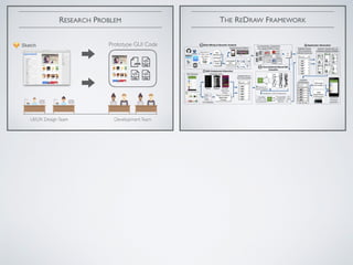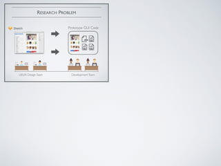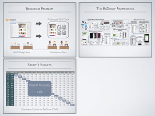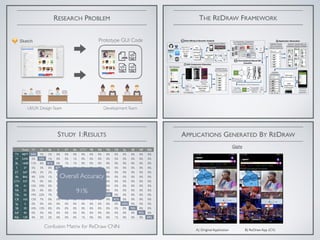 The document discusses a machine learning-based approach for prototyping graphical user interfaces (GUIs) in mobile apps, addressing challenges such as market competitiveness and user feedback. It details a multi-phase process involving GUI component detection, classification, and hierarchy construction using deep learning techniques, particularly Convolutional Neural Networks (CNNs). An empirical study evaluates the accuracy of the CNN classifier in recognizing various GUI components, highlighting the project's industrial applicability.