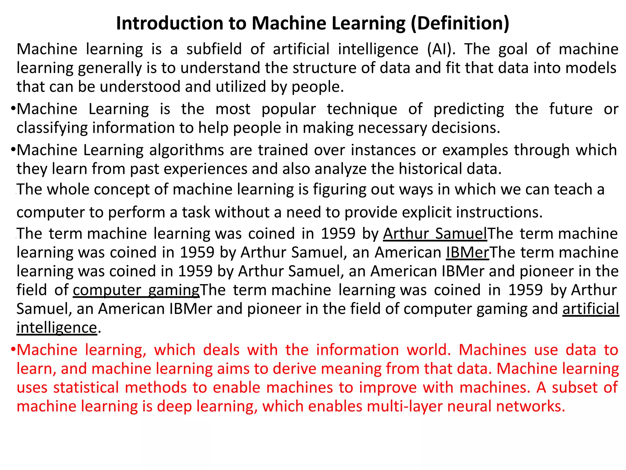 This document provides an overview of machine learning concepts and techniques. It discusses supervised learning methods like classification and regression using algorithms such as naive Bayes, K-nearest neighbors, logistic regression, support vector machines, decision trees, and random forests. Unsupervised learning techniques like clustering and association are also covered. The document contrasts traditional programming with machine learning and describes typical machine learning processes like training, validation, testing, and parameter tuning. Common applications and examples of machine learning are also summarized.