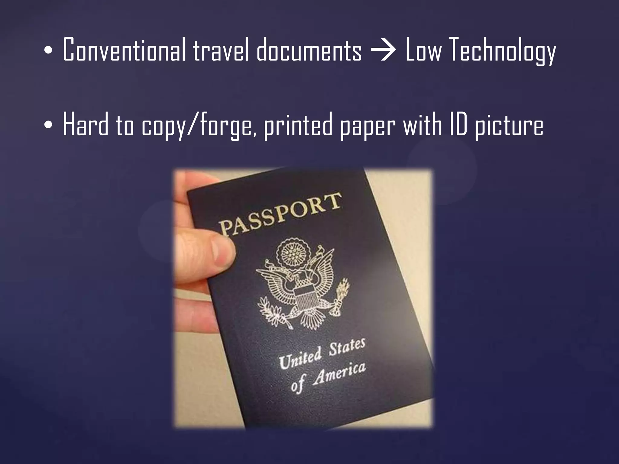 The document discusses the evolution of biometric passports and their security features, highlighting the importance of machine-readable zones and the integration of biometric data for identity verification. It outlines the security mechanisms, including encryption methods, that protect against various threats such as eavesdropping and cloning. Additionally, it notes compliance with International Civil Aviation Organization (ICAO) standards and variations in e-passport implementations across different countries.