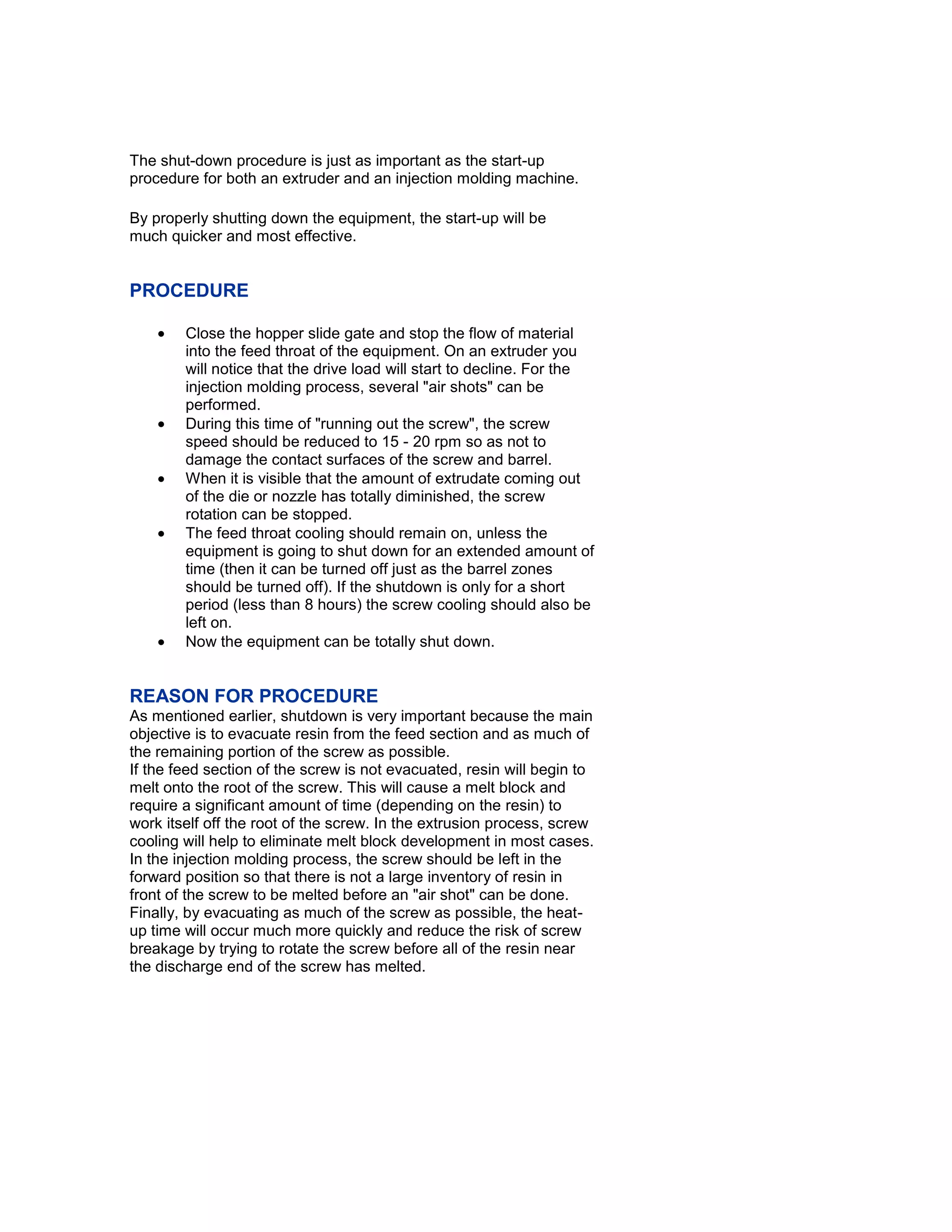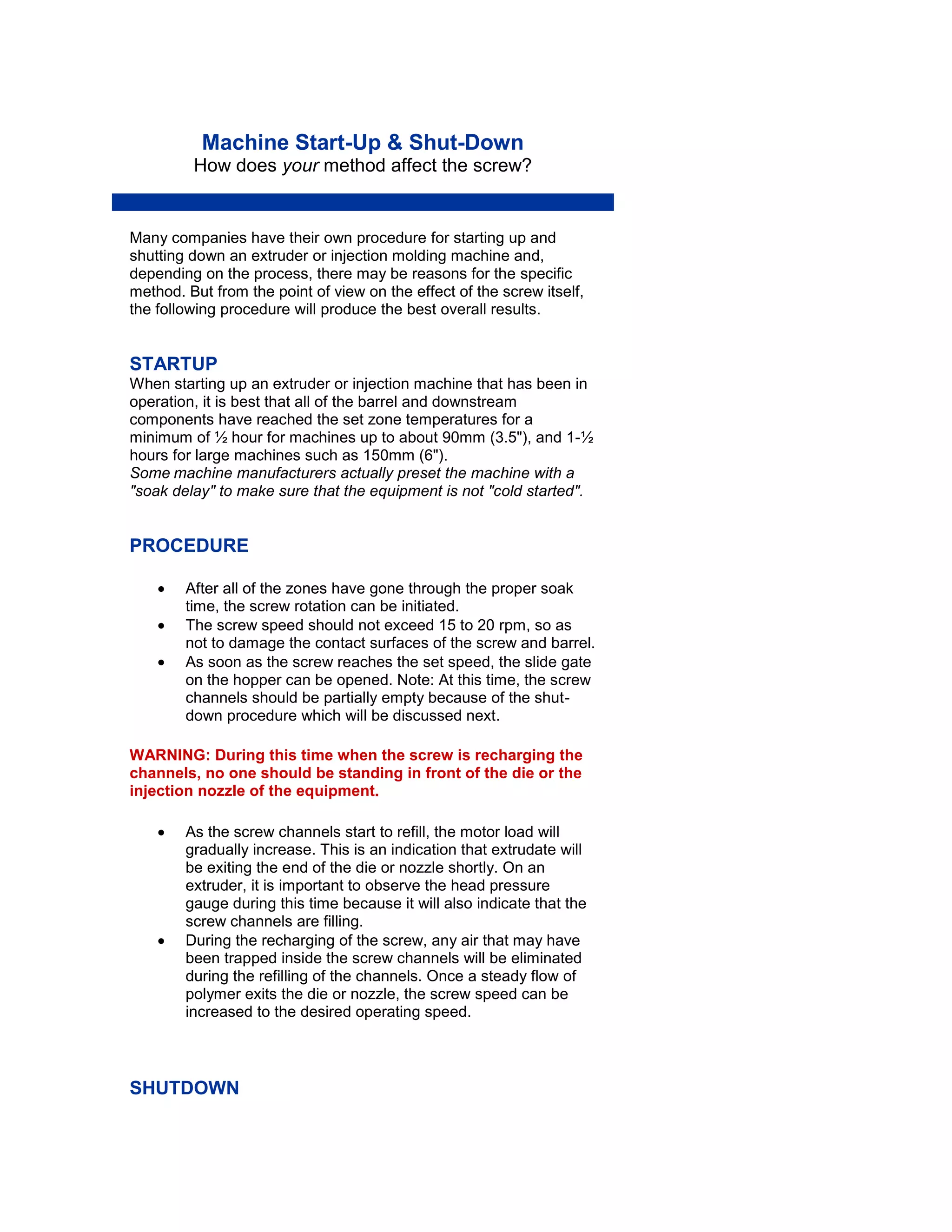 Proper start-up and shut-down procedures for extruders and injection molding machines are crucial to maintain screw integrity and performance. During start-up, the machine components should reach set temperatures before initiating screw rotation, while for shut-down, it's essential to evacuate resin from the screw to prevent melt blocks. Following these procedures ensures quicker and more efficient operations and reduces risks associated with screw damage.