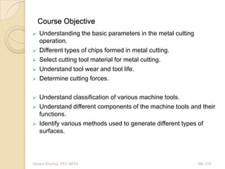 This document provides information about the ME 210 "Machine Tools and Machining" course taught by Vikrant Sharma at MITS University. The course objectives are to understand basic machining parameters, tool wear, machine tools, and methods for generating surfaces. Recommended textbooks are listed. Manufacturing is defined as the process of converting raw materials into products through value-adding processes. Machining involves gradually removing excess material from a workpiece in the form of chips using cutting tools. Machine tools are powered devices that facilitate machining processes. Chip formation and types of chips formed are also discussed.