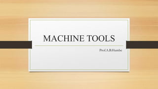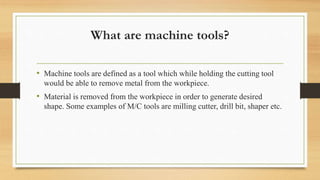 The document discusses different types of machine tools and lathe machines. It provides classifications of machine tools based on production capability, and describes the main parts and operations of lathe machines. It also covers different types of drilling machines such as portable, sensitive, upright, radial, gang and multiple spindle drilling machines.