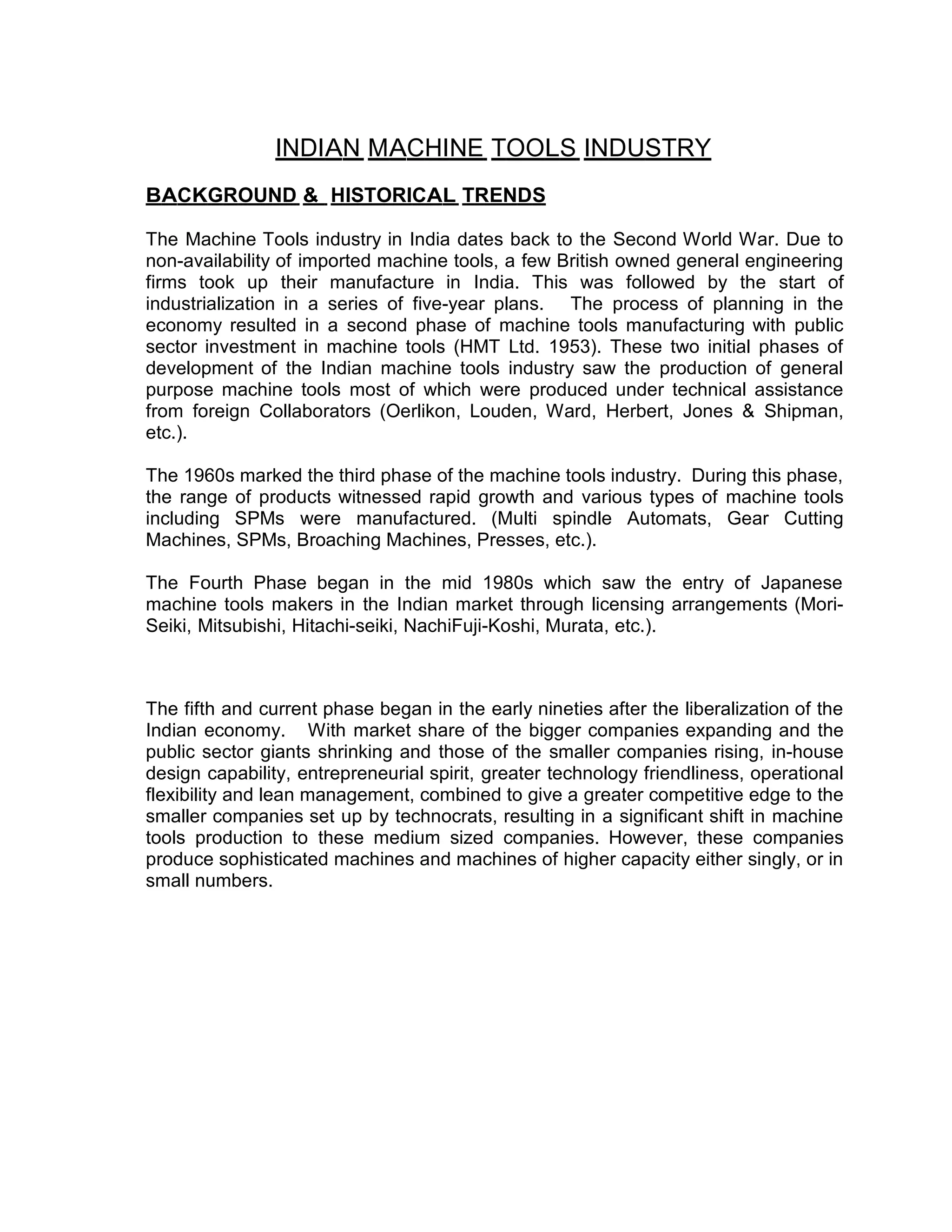 The document provides background information on the machine tools industry in India. It discusses 5 phases of development from World War 2 to present day. It then discusses international trends, noting that Japan is the top producer. For India, it outlines the current status including production of CNC machines, locations of manufacturing, and key players. It also discusses the structure of the Indian industry, noting most companies are small/medium and domestically focused.