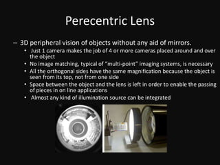 Machine vision uses computer vision techniques to automate inspection and measurement tasks in manufacturing processes. It incorporates computer science, optics, and mechanical engineering. Machine vision systems typically use digital cameras and specialized lenses to capture images that are then processed to check for attributes like dimensions, serial numbers, and defects. Common applications include inspecting semiconductor chips, automobiles, food, and pharmaceuticals. Key components of machine vision systems include cameras, lighting, lenses, and image processing software to analyze the captured images.