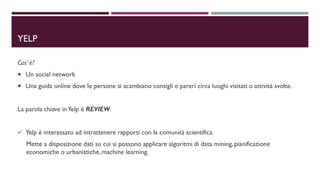 Il documento discute l'analisi del dataset di Yelp per valutare l'efficacia della distribuzione di coupon promozionali. Si utilizzano metodi di machine learning, in particolare SVM e Random Forest, per classificare gli utenti e i business, ottimizzando quando e a chi fornire i coupon. Nonostante le sfide presentate, i risultati mostrano un potenziale significativo per selezionare i consumatori interessati in momenti favorevoli.