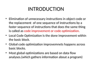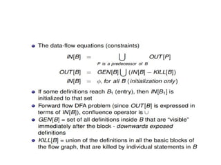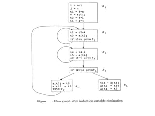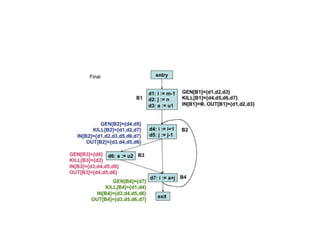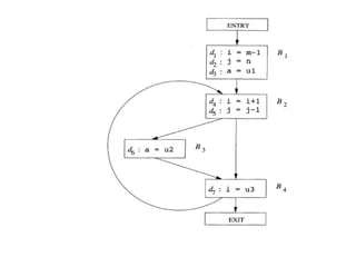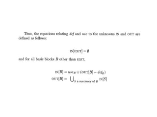 The document discusses machine-independent optimization techniques in programming, focusing on code improvement through local and global optimizations, including eliminating unnecessary instructions and applying transformations like copy propagation and dead code elimination. It introduces data flow analysis and the use of flow graphs to represent control structures and optimize code execution paths. Key concepts like reaching definitions, live variable analysis, and available expressions are illustrated with examples to demonstrate their importance in enhancing program efficiency.