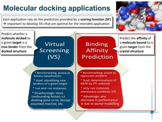 This document discusses the development and performance of machine-learning scoring functions (ML SFS) for predicting binding affinities in molecular docking, particularly focusing on the rf-score series. The findings highlight that ML SFS outperforms traditional scoring functions, especially with larger training sets and data-driven feature selection. It emphasizes the challenges and future directions in optimizing these scoring functions for diverse protein-ligand complexes.