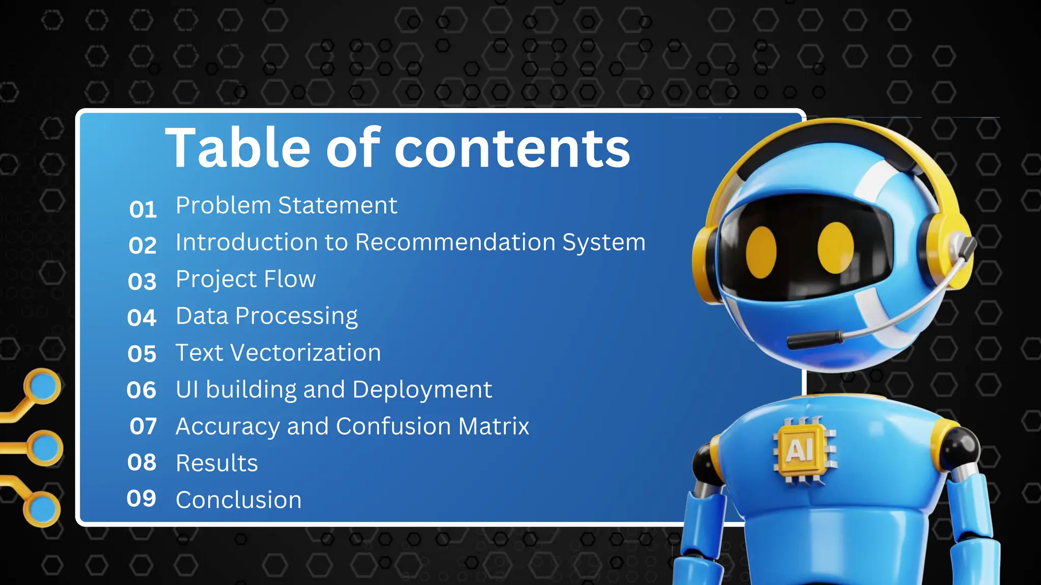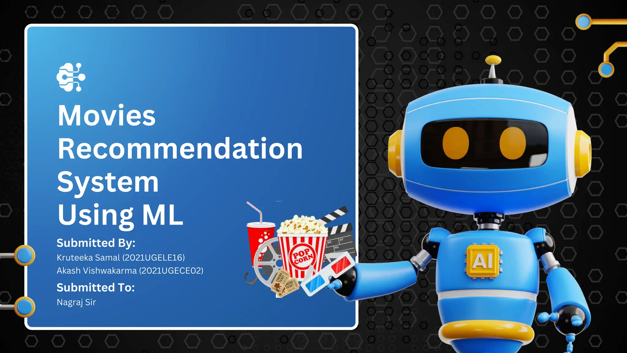The document describes a movie recommendation system project that uses machine learning. It includes sections on the problem statement, recommendation systems, the project workflow including data collection, processing, text vectorization, building a user interface, accuracy metrics, and results. The goal is to recommend movies to users based on their preferences using collaborative filtering techniques.