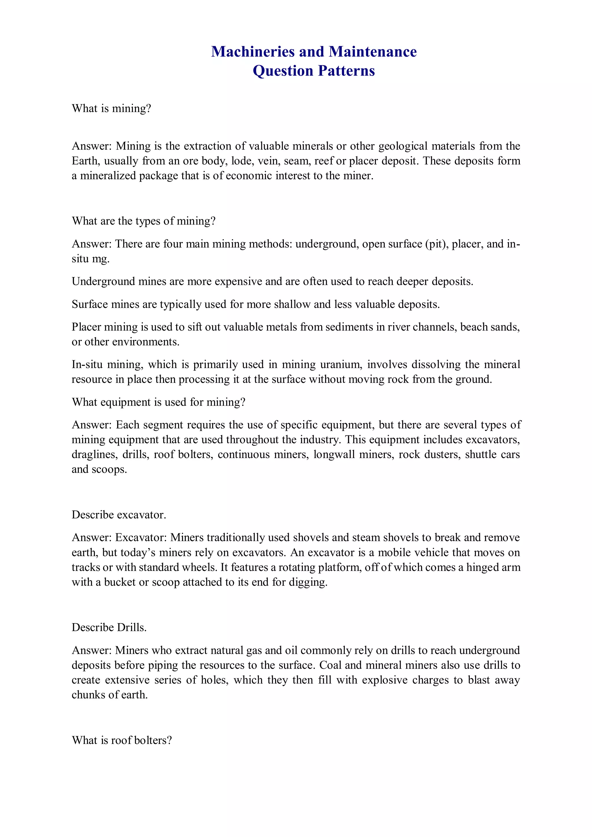 Mining is the extraction of valuable minerals or geological materials from the earth, with various methods including underground, surface, placer, and in-situ mining. The document describes different types of mining equipment, such as excavators, drills, roof bolters, shuttle cars, draglines, continuous miners, and rock dusters, as well as drilling techniques like rotary and percussion drilling. Additional operations, safety measures, and advantages and disadvantages of various drilling methods and equipment are also discussed.