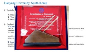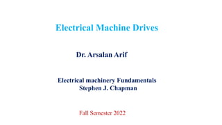 This document summarizes Dr. Arsalan Arif's Electrical Machine Drives course for the Fall 2022 semester. It discusses control and design of machine drives like induction motors, Vernier machines, and brushless wound rotor synchronous machines. Applications include electric cars and golf carts. The document also lists several of Dr. Arif's publications related to permanent magnet machines and brushless synchronous generators.