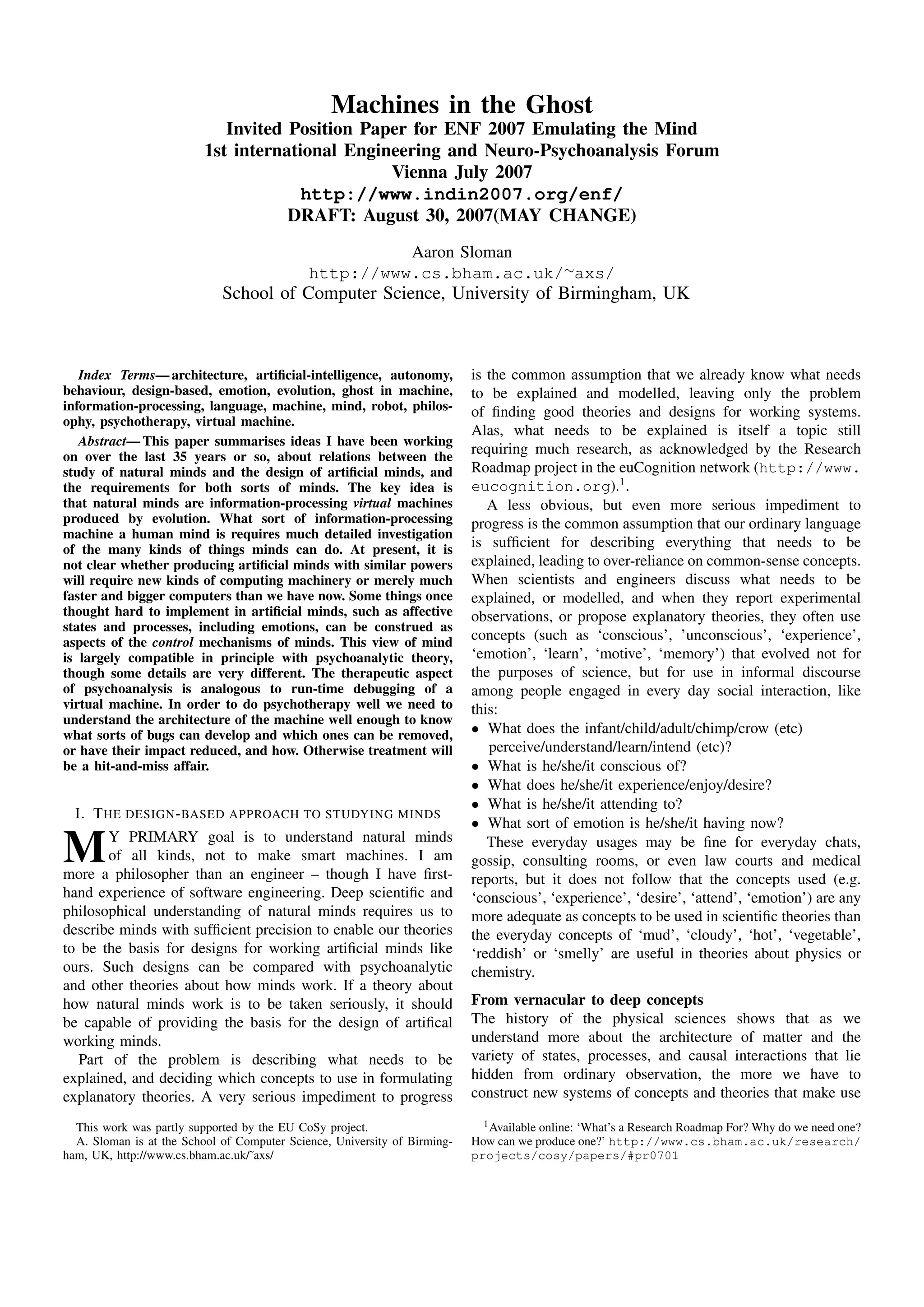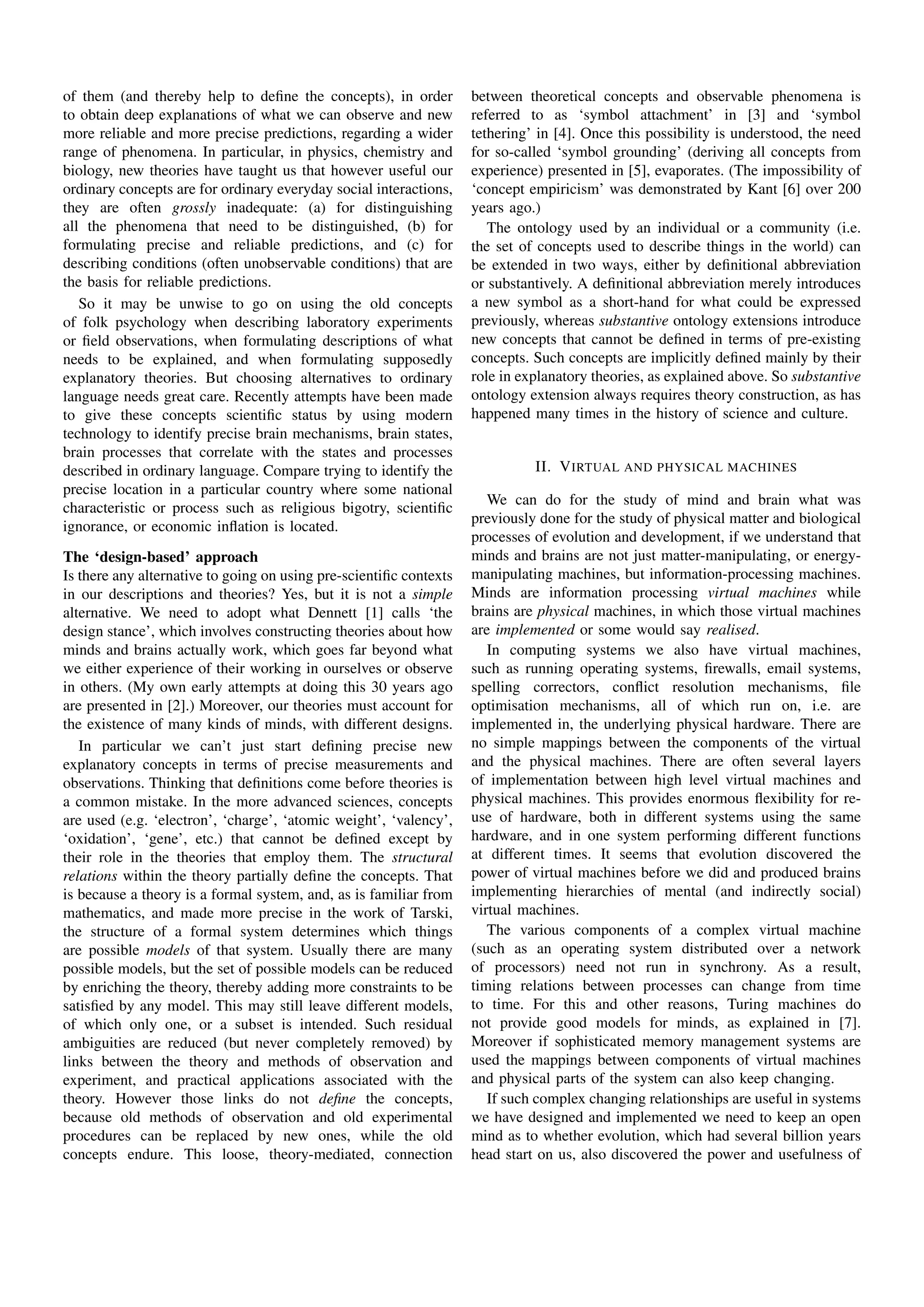 This document discusses the idea that natural minds are information-processing virtual machines that have been produced by evolution. It argues that to truly understand natural minds, we need to describe them with sufficient precision to enable the design of artificial minds. The key challenges are determining what concepts to use in theories of the mind and deciding whether producing artificial minds similar to natural ones will require new computing machinery. The document also discusses how virtual machines in computers can have causal powers and how psychotherapy can be viewed as debugging the "virtual machine" of the mind.