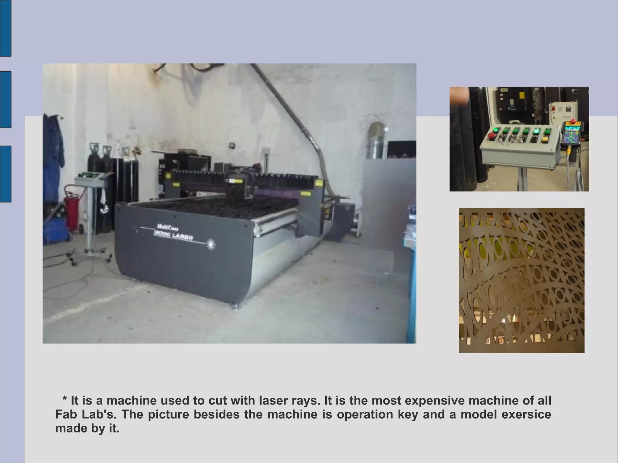 The laser cutter is the most expensive machine in the Fab Lab that uses laser rays to cut materials. It has an operation key and was used to make a sample model. The 3D printer creates 3D models while the vacuum cleaner cleans them. The CNC milling machine and 3D scanner were also present.