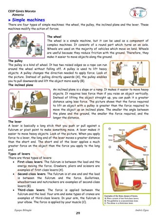 The document discusses machines and structures as part of a 5th grade curriculum. It defines machines as devices that convert one type of energy into another, and provides examples of simple machines like wheels, pulleys, inclined planes, and levers that modify the application of forces. It also describes the typical components of machines like motors, electrical circuits, sensors, and indicators. Machines are classified based on their energy source such as human, water, fuel, or electricity. Overall, the document provides a basic overview of what machines are and some of their common components and uses.