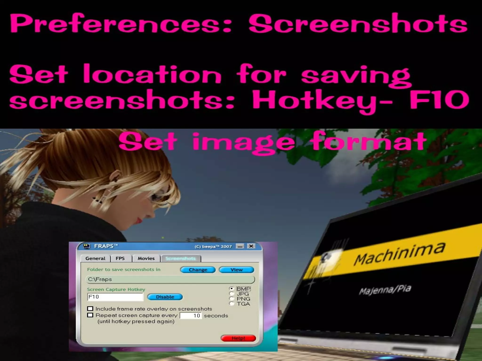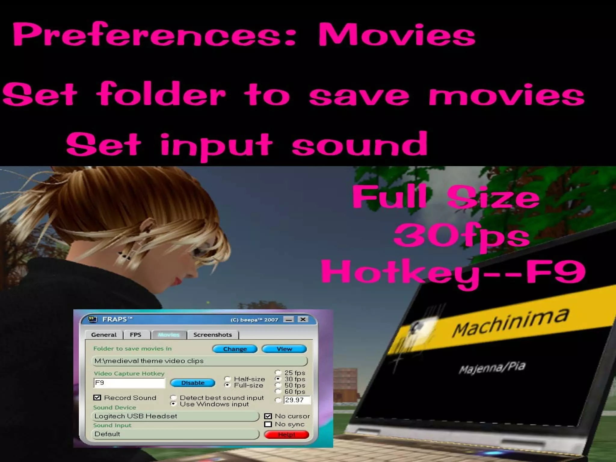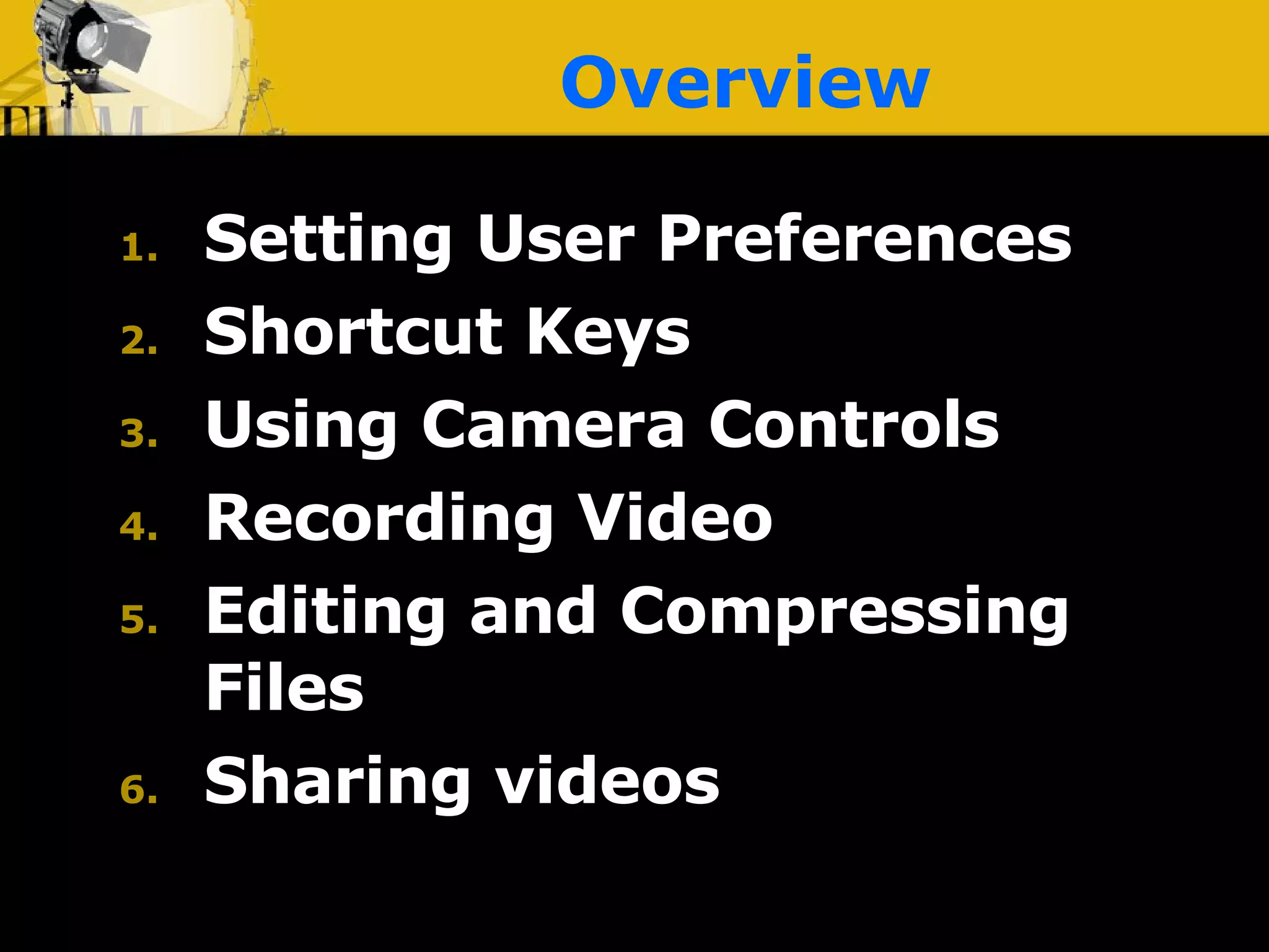 The document provides instructions for various tasks related to creating machinima videos in Second Life, including setting user preferences, using camera controls, recording video, editing and compressing files, and sharing videos. It discusses adjusting settings like draw distance and mouse sensitivity, using shortcut keys for camera movements, recommended video recording programs, tips for capturing and editing footage, and video hosting sites for sharing finished videos.