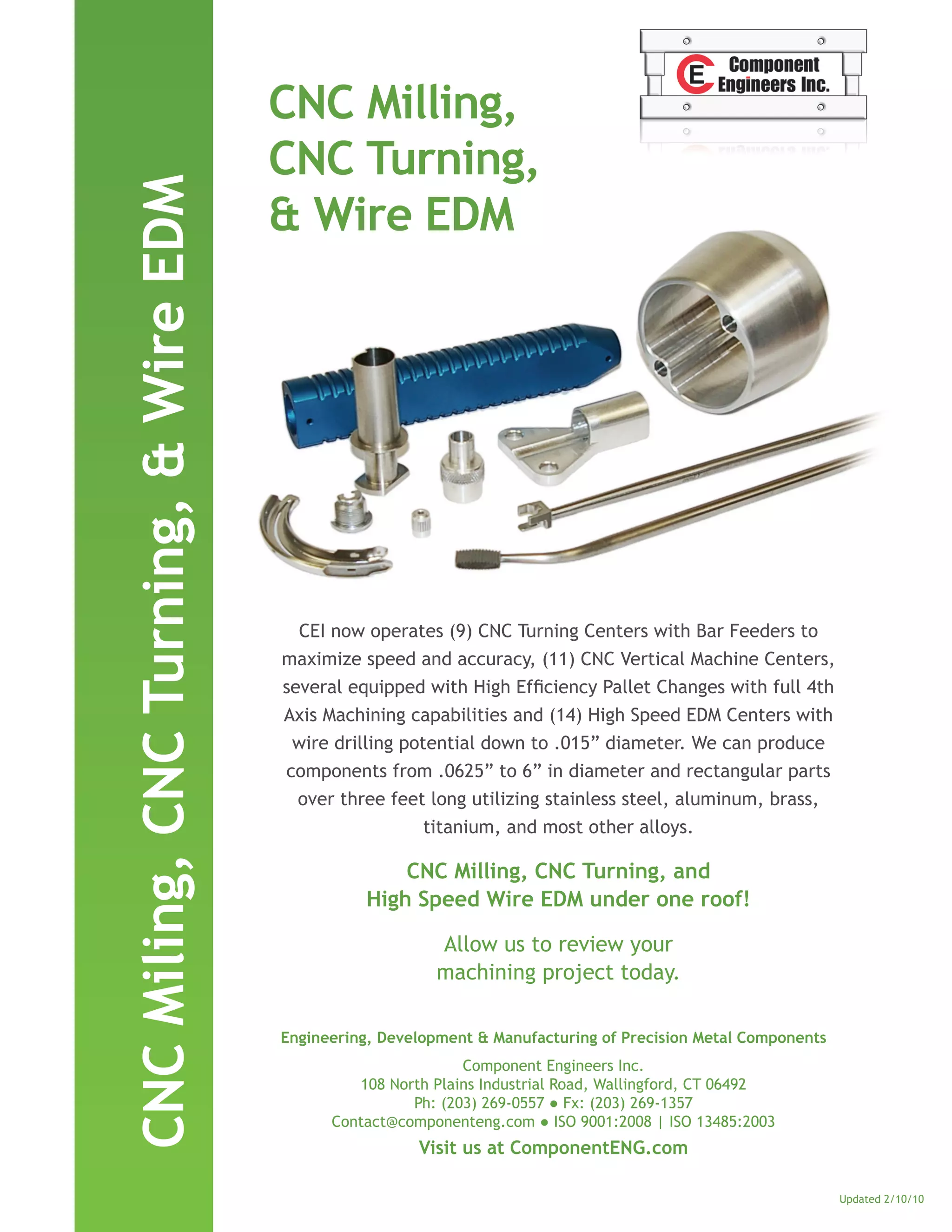 The document describes the CNC milling, turning, and wire EDM capabilities of Component Engineers Inc. They operate 9 CNC turning centers with bar feeders, 11 CNC vertical machine centers including some with 4th axis capabilities, and 14 high speed EDM centers that can drill as small as 0.015 inches. They can produce parts from 0.0625 to 6 inches in diameter and over 3 feet long in various metal alloys under one roof.
