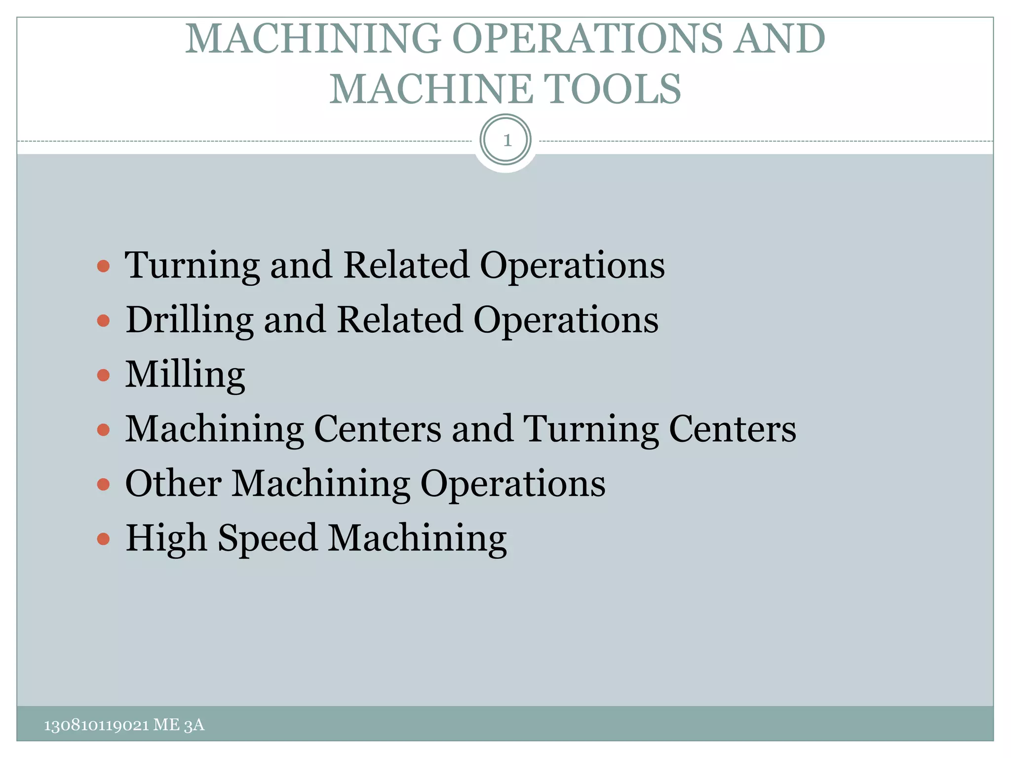 This document discusses various machining operations and machine tools used in manufacturing. It describes turning operations which use a single point cutting tool on a lathe to generate cylindrical parts. Milling operations employ a rotating cutting tool with multiple edges to cut planar surfaces. Other operations covered include drilling, boring, tapping and shaping. A variety of machine tools are discussed for performing these operations, including lathes, milling machines, drill presses, shapers and sawing machines. The document provides detailed explanations of each machining process along with example applications and illustrations.