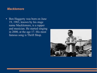 Ben Haggerty, known by his stage name Macklemore, is a rapper and musician from Seattle, Washington. He started his music career in 2000 under the name Professor Macklemore and released his first studio album The Language of My World in 2005. Macklemore's debut album The Heist, released in 2012, was a commercial success and included the hit singles "Thrift Shop", "Can't Hold Us", and "Wings". Currently Macklemore continues to make music with collaborator Ryan Lewis and performs worldwide.