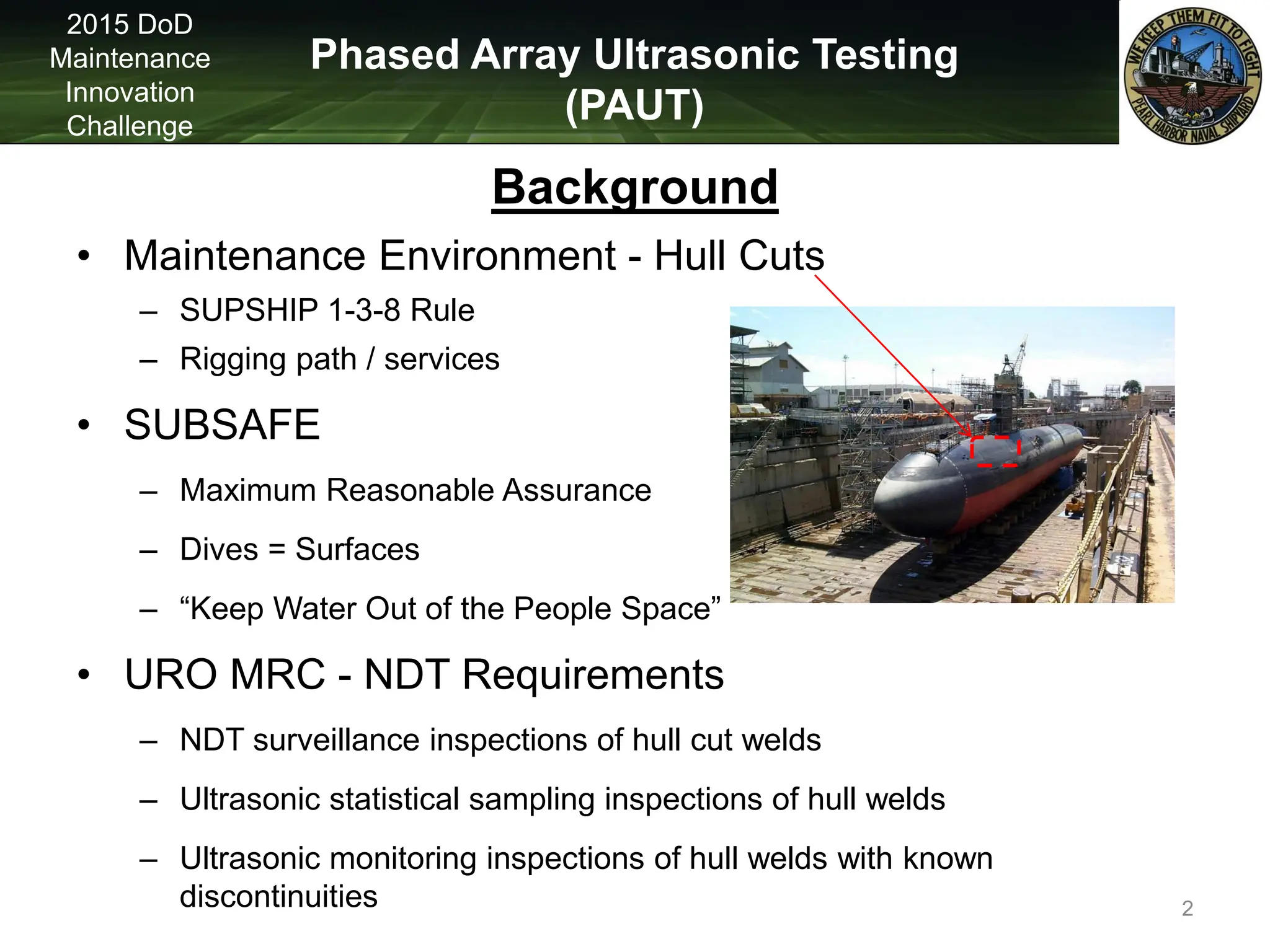The document discusses the implementation of Phased Array Ultrasonic Testing (PAUT) to improve the accuracy and efficiency of hull weld inspections in the Navy. PAUT offers significant advantages over conventional ultrasonic testing by enabling multiple angle inspections and digital data storage, reducing time and costs while increasing measurement precision. Despite initial costs and training requirements, the technology is proven effective and has potential for wider integration within Navy maintenance processes.