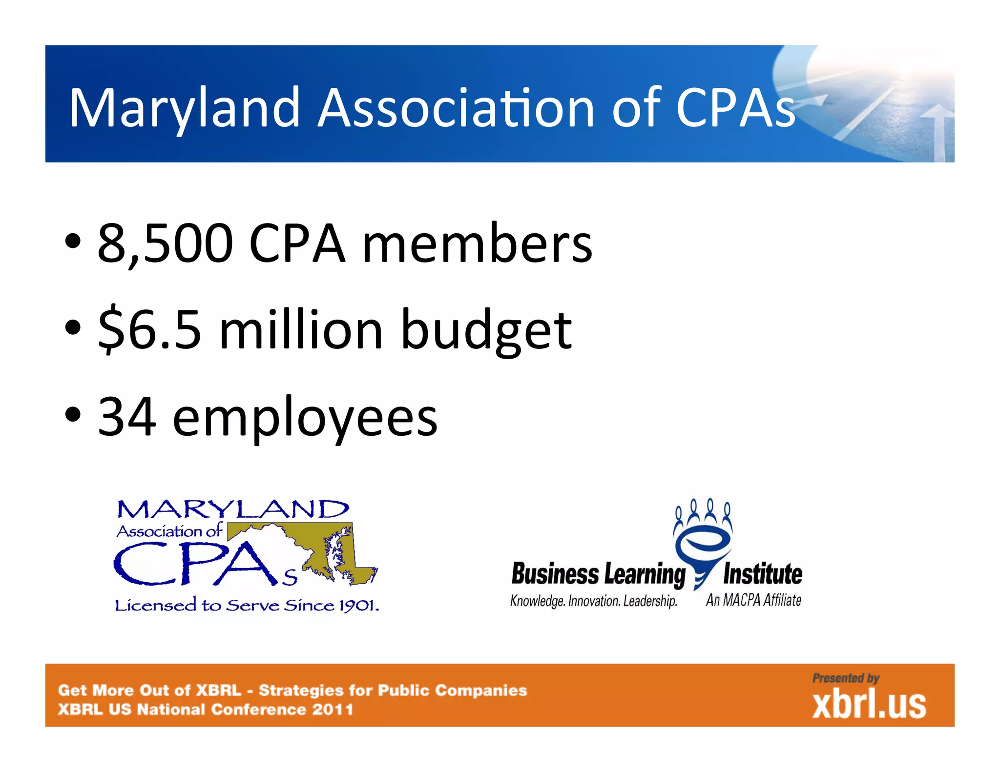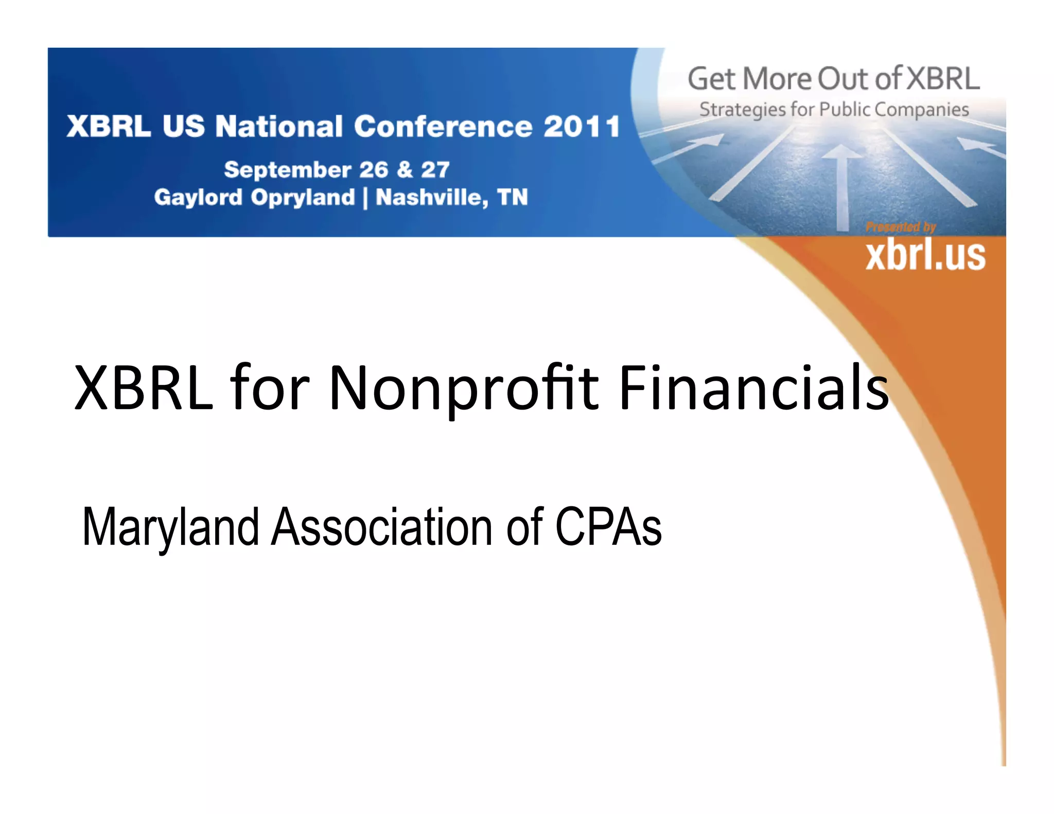 This document discusses the Maryland Association of CPAs' work with XBRL (eXtensible Business Reporting Language) for nonprofit financial reporting. Some key points: