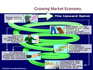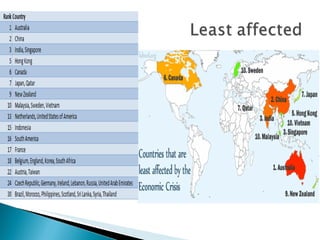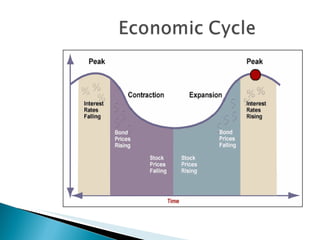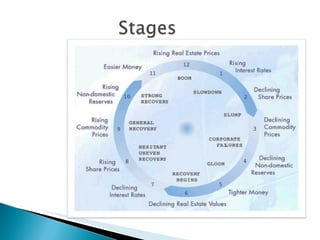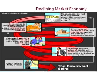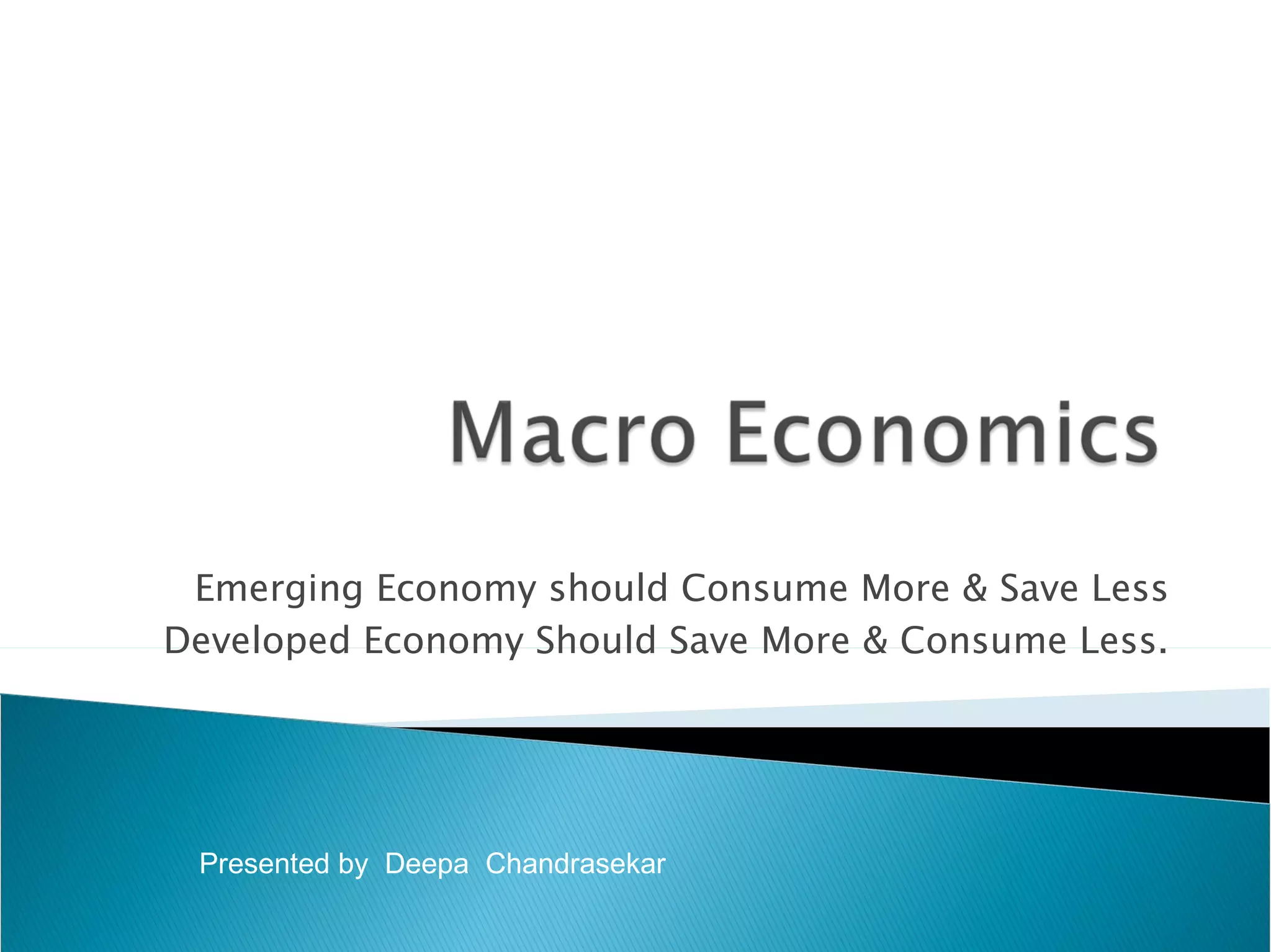 The document discusses macroeconomic factors that influence recessions and recoveries. It suggests that for an economy to recover from recession, emerging economies should consume more and save less, while developed economies should save more and consume less. This allows demand and markets to recover through increased consumption in emerging markets and increased savings in developed markets. Government fiscal and monetary policies can encourage these behaviors through tax benefits, government spending, unemployment insurance, interest rates and required cash reserves.