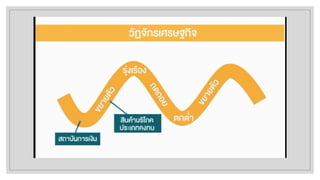 ระยะนี้ ราคาสินค้าค่อยๆสูงขึ้น การลงทุนเพิ่มขึ้น การจ้างงานมากขึ้น ขยายการผลิตมากขึ้น ทําให้รายได้มากขึ้น ◦ การชะลอตัว/ถดถอย(recession) ระยะนี้ เศรษฐกิจเติบโตเต็มที่แล้ว อัตราผลตอบแทน จากการลงทุนตกตํ่าลง เนื่องจากผลผลิตมาก ต้นทุนสูงขึ้น การลงทุนลดลง เกิด ภาวะการว่างงาน รายได้ลดลง ◦ การหดตัว/ตกตํ่า(depression) ระยะนี้ ภาวะเศรษฐกิจตกตํ่าอย่างรวดเร็วเนื่องจากการ หดตัวของการลงทุน ทําให้รายได้ตํ่าลง การว่างงานมากขึ้น ◦ การฟื้นตัว (recovery) ระยะนี้ เศรษฐกิจฟื้นตัว