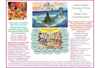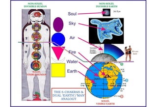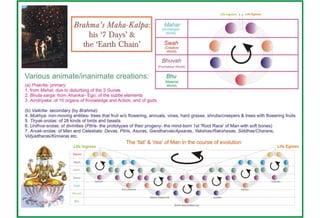 The document describes the macrocosm and microcosm in Hindu cosmology. It details the 7 upper and 7 nether regions that make up the macrocosm, as well as their corresponding chakras in the human microcosm. It explains that just as there are 7 continents, elements, and sheaths in the macrocosmic universe, these 7 aspects are reflected in the 7 chakras and koshas of the human body and consciousness. The key idea is that "the macrocosm is in the microcosm," meaning the large-scale structure of existence is mirrored in miniature within each individual.