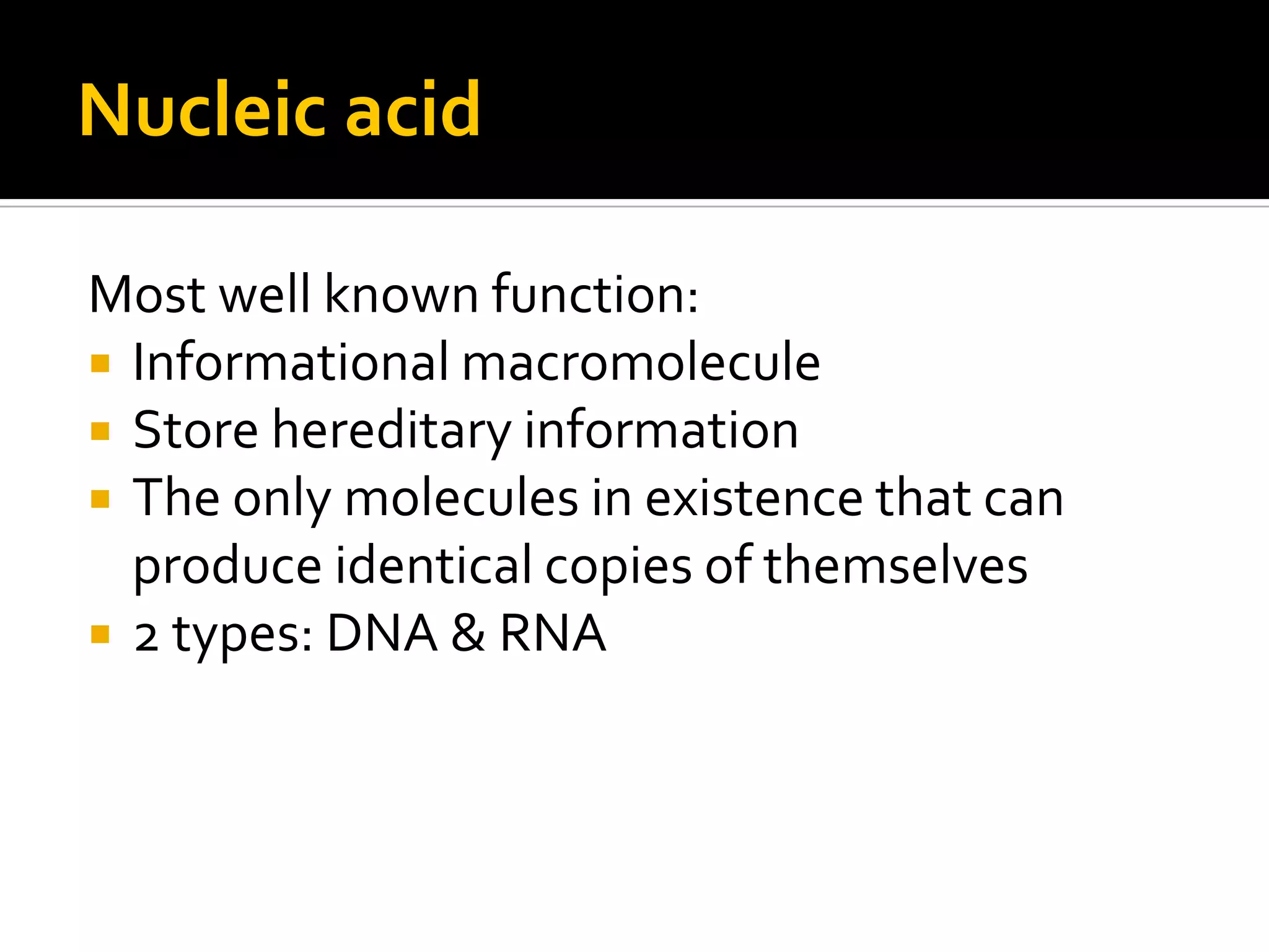 Nucleic acids like DNA and RNA function as informational macromolecules that store hereditary information and can produce identical copies of themselves. They are composed of nucleotides, which consist of a nitrogenous base, a pentose sugar (ribose in RNA and deoxyribose in DNA), and phosphate groups. Nucleotides bond together via phosphodiester bonds between the sugar and phosphate groups to form single strands that then interact through base pairing between complementary bases (A-T and C-G in DNA, A-U and C-G in RNA) to form the signature structures of DNA and RNA.