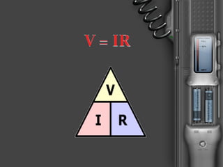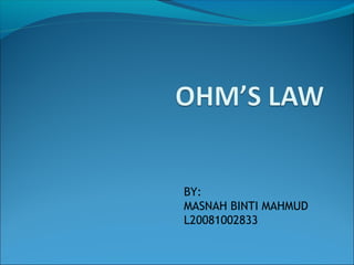 This document discusses the relationship between electric current and potential difference. It defines potential difference as the work done to move one coulomb of charge between two points. It states that the potential difference across a metallic conductor is directly proportional to the current through it when temperature and other conditions are constant, known as Ohm's Law. The objectives are for students to understand this relationship, state Ohm's Law, and solve problems involving potential difference, current and resistance.