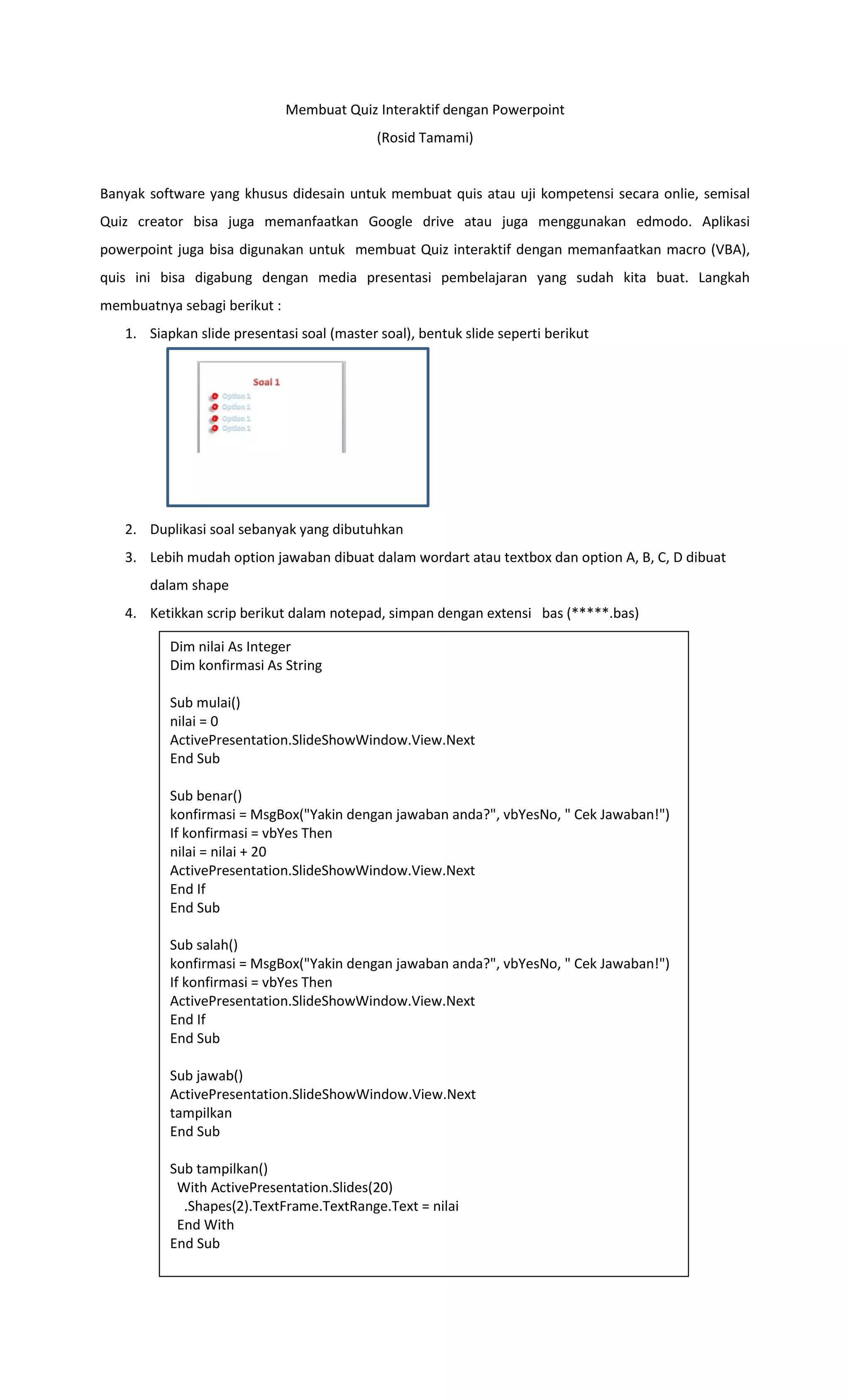 Dokumen tersebut memberikan instruksi lengkap untuk membuat quiz interaktif menggunakan PowerPoint dengan menambahkan macro Visual Basic for Applications (VBA). Langkah-langkahnya adalah menyiapkan slide soal dan jawaban, menulis kode VBA untuk menghitung skor yang benar dan salah, lalu menghubungkan kode tersebut ke tombol-tombol jawaban di setiap slide quiz menggunakan fitur Action dari PowerPoint.