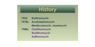 Macrolide antibiotics are a class of antibiotics that contain a macrocyclic lactone ring attached to deoxy sugars. They are usually obtained from actinomycetes bacteria and are bacteriostatic, inhibiting bacterial protein synthesis by binding to the 50S ribosomal subunit. First-line uses include treating atypical pneumonia, H. pylori, and allergies to penicillin. Later discoveries expanded the ring size and added groups to increase stability, spectrum, and pharmacokinetics. Macrolides degrade under acidic conditions through an intramolecular reaction forming an inactive ketal.