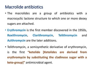 This document discusses macrolide antibiotics, including their structure, examples (erythromycin, azithromycin), mechanism of action, spectrum of activity, resistance, pharmacokinetics, adverse effects, drug interactions, and contraindications. Macrolides bind to the bacterial ribosome and inhibit protein synthesis, generally being bacteriostatic. Their spectrum includes many gram-positive bacteria and some intracellular pathogens. Resistance can occur via efflux pumps or ribosomal mutations. Adverse effects include gastrointestinal issues and ototoxicity. Macrolides can interact with drugs metabolized by CYP450 enzymes.