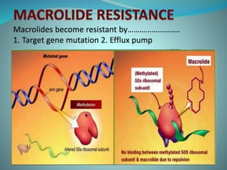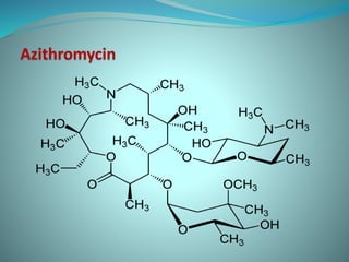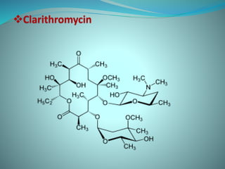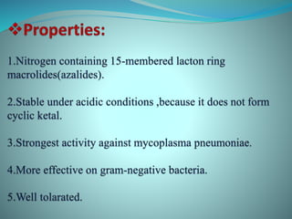 The document provides an in-depth overview of macrolide antibiotics, including their definition, chemical structure, mechanism of action, and types. It discusses their broad-spectrum activity against various infections, pharmacokinetics, resistance, indications, contraindications, and side effects. Specific macrolides like erythromycin, azithromycin, and clarithromycin are highlighted, along with their physical properties, dosage forms, and therapeutic uses.
