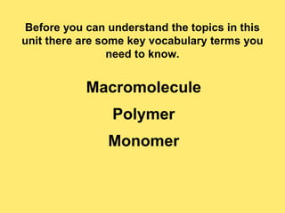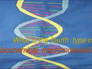 The document discusses the four classes of biological macromolecules: proteins, lipids, carbohydrates, and nucleic acids. It provides details about each macromolecule, including their monomers, polymers, structure, functions in the body, and examples of where they can be found. Carbohydrates are made of monomers of glucose and provide energy. Proteins are made of amino acid monomers and are involved in structure, enzymes, and hormones. Lipids are made of glycerol and fatty acid monomers and function in energy storage, insulation, and hormones.