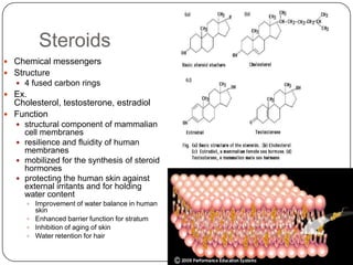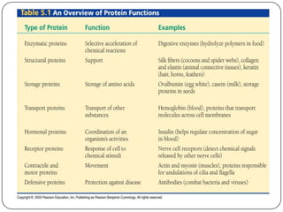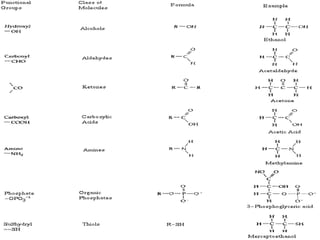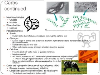 The document discusses the four major macromolecules that make up living organisms: carbohydrates, proteins, lipids, and nucleic acids. It describes the monomers (sugars, amino acids, fatty acids, nucleotides) that polymerize to form each macromolecule, and their structures, functions, and important examples like glucose, glycogen, amino acids, DNA, RNA, glycerol, and fatty acids. It also covers general concepts like dehydration synthesis, hydrolysis, and protein structure levels from primary to quaternary.
