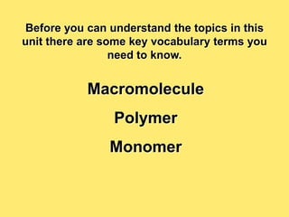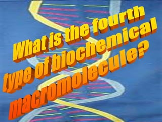 There are four main classes of biological macromolecules: proteins, lipids, carbohydrates, and nucleic acids. The document provides information about each macromolecule including what they are made of, where they are found, and their functions. It also discusses that carbohydrates, lipids, and proteins can be used by the body for energy, while nucleic acids do not provide energy.