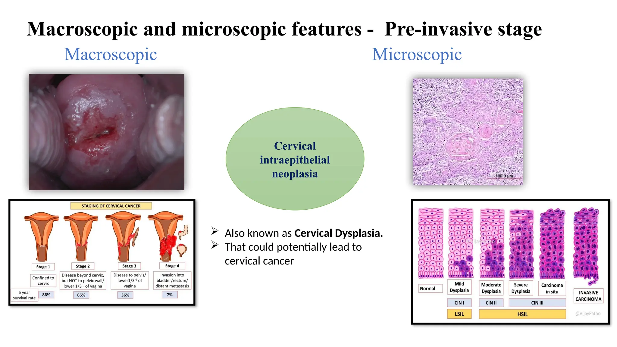 Cervical polyps are benign tumors from the endocervical epithelium, presenting in various shapes and colors. They are primarily covered by endocervical epithelium, which may undergo squamous metaplasia, while the stroma comprises loose fibrous tissue with glands. Additionally, pre-invasive and invasive stages of cervical neoplasia and carcinoma are characterized by specific macroscopic and microscopic features, with invasive carcinoma displaying irregular nests of neoplastic squamous epithelium.