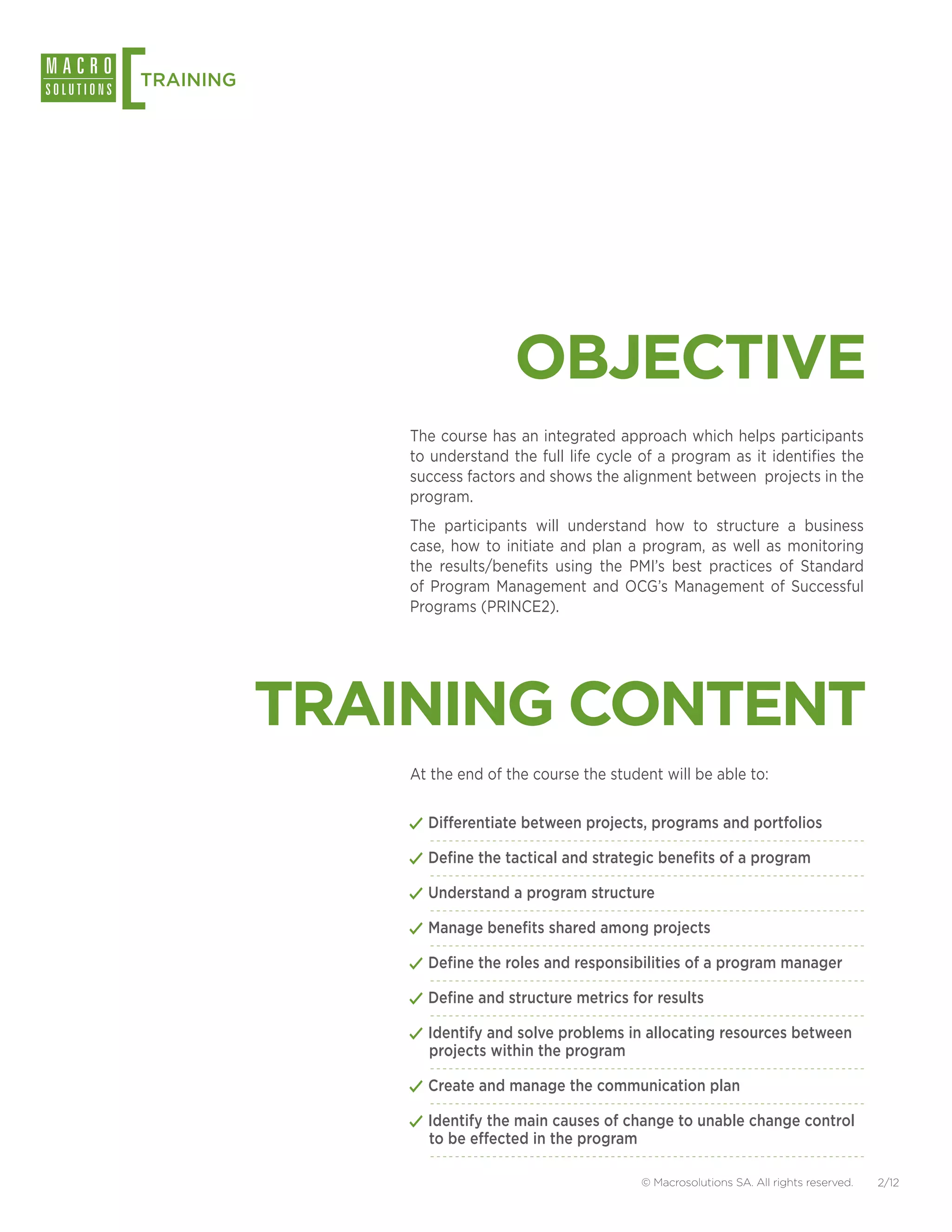 This training document describes a program management training course. The objective of the course is to help participants understand the full life cycle of a program and identify success factors by learning best practices from PMI and PRINCE2. The 16-hour course covers topics like differentiating projects, programs, and portfolios; structuring a program; the five phases of the program life cycle from initiating to closing; and managing complexity in a program environment. The course uses case studies, videos, group work, and simulations to reinforce learning.