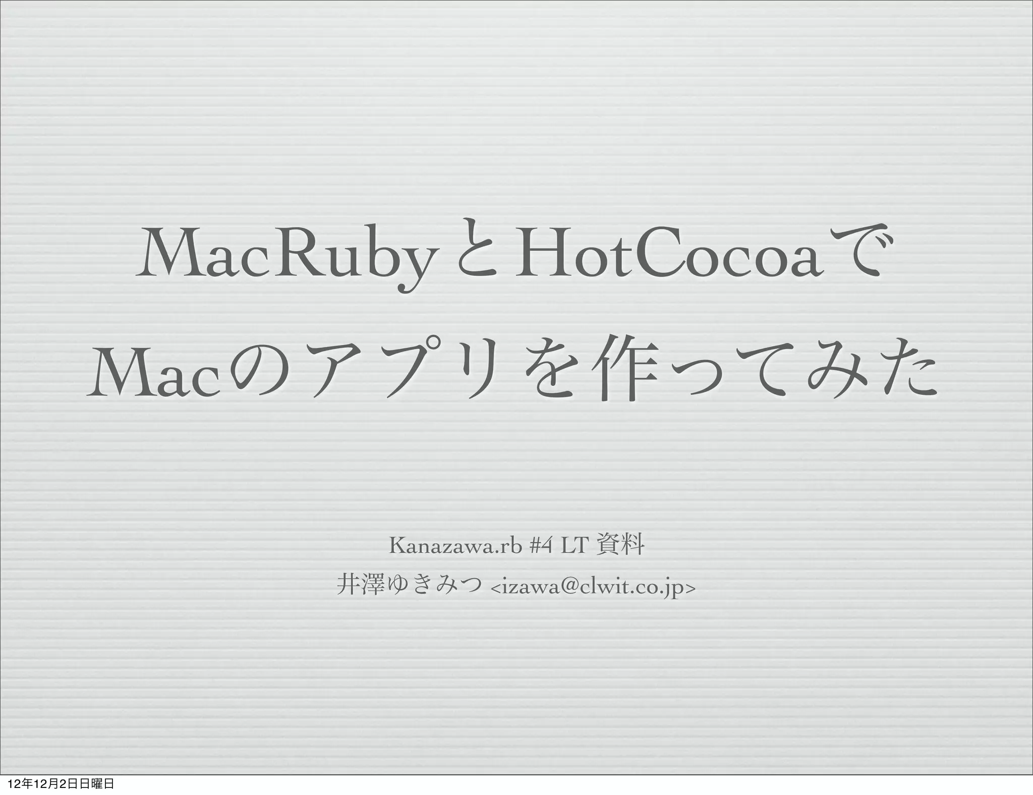Macのアプリを作ってみた Kanazawa.rb #4 LT 資料 井澤ゆきみつ <izawa@clwit.co.jp> 12年12月2日日曜日