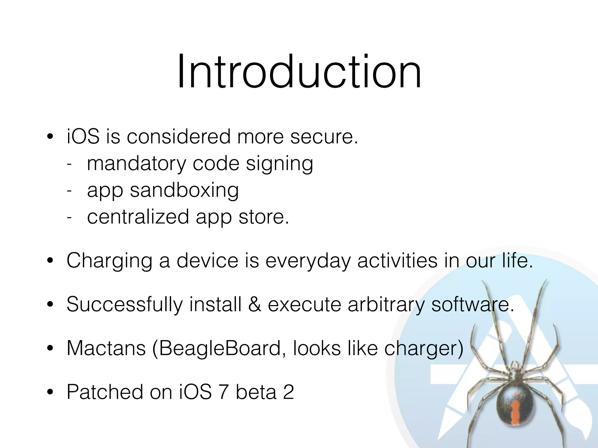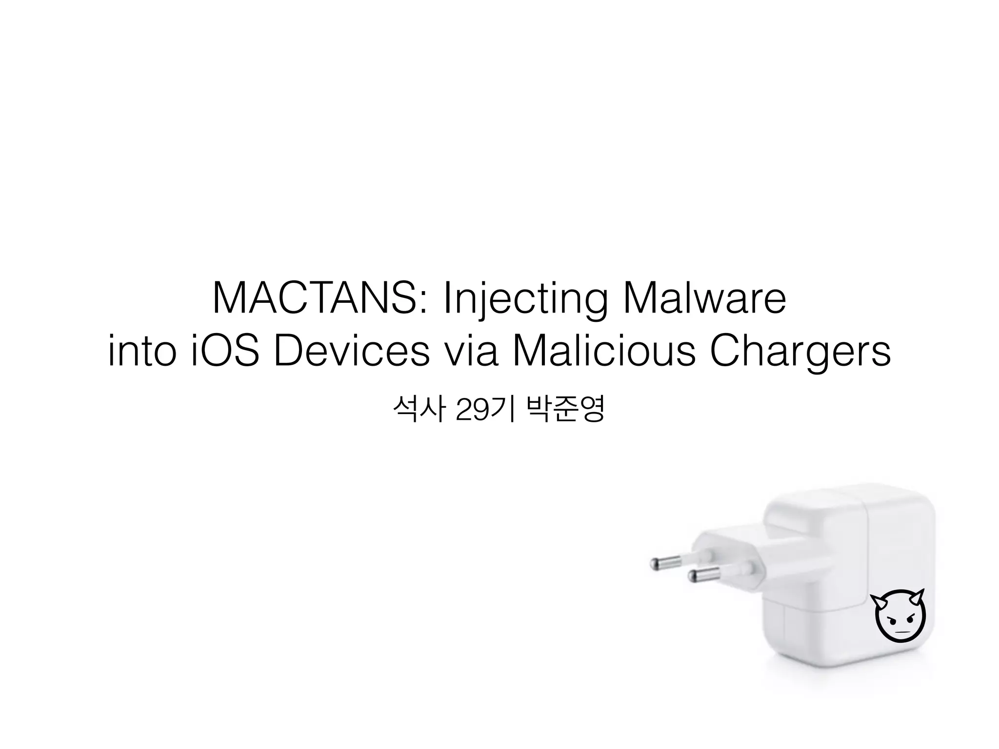 Mactans is a proof-of-concept malicious charger that can inject malware into iOS devices via their charging port. It works by first obtaining the device's UDID to register it and generate a provisioning profile, allowing installation of apps signed by a non-Apple entity. The charger then replaces a legitimate app with a hidden, repackaged version containing malware. When launched, the malware executes before the original app. This attack highlights issues with iOS trusting any host device and the ease of provisioning profiles to install third-party apps without user interaction. Apple has since patched the vulnerabilities in iOS 7, but similar attacks may still target public charging stations or modified environments to infect devices stealthily.