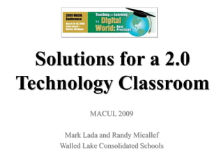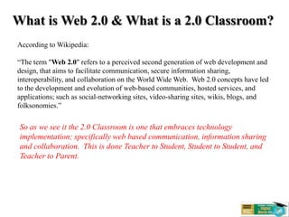 Web 2.0 aims to facilitate communication, sharing, and collaboration on the World Wide Web through social networking sites, video sharing, wikis, blogs, and folksonomies. The 2.0 classroom embraces this technology implementation for teacher-student, student-student, and teacher-parent interactions. Components of the 2.0 classroom include classroom websites, podcasts using Audacity and Gcast, screencasts using Jing and Xtranormal, blogs and wikis using Edublogs and Wikispaces, and information sharing using Delicious, Moodle, and Slideshare.