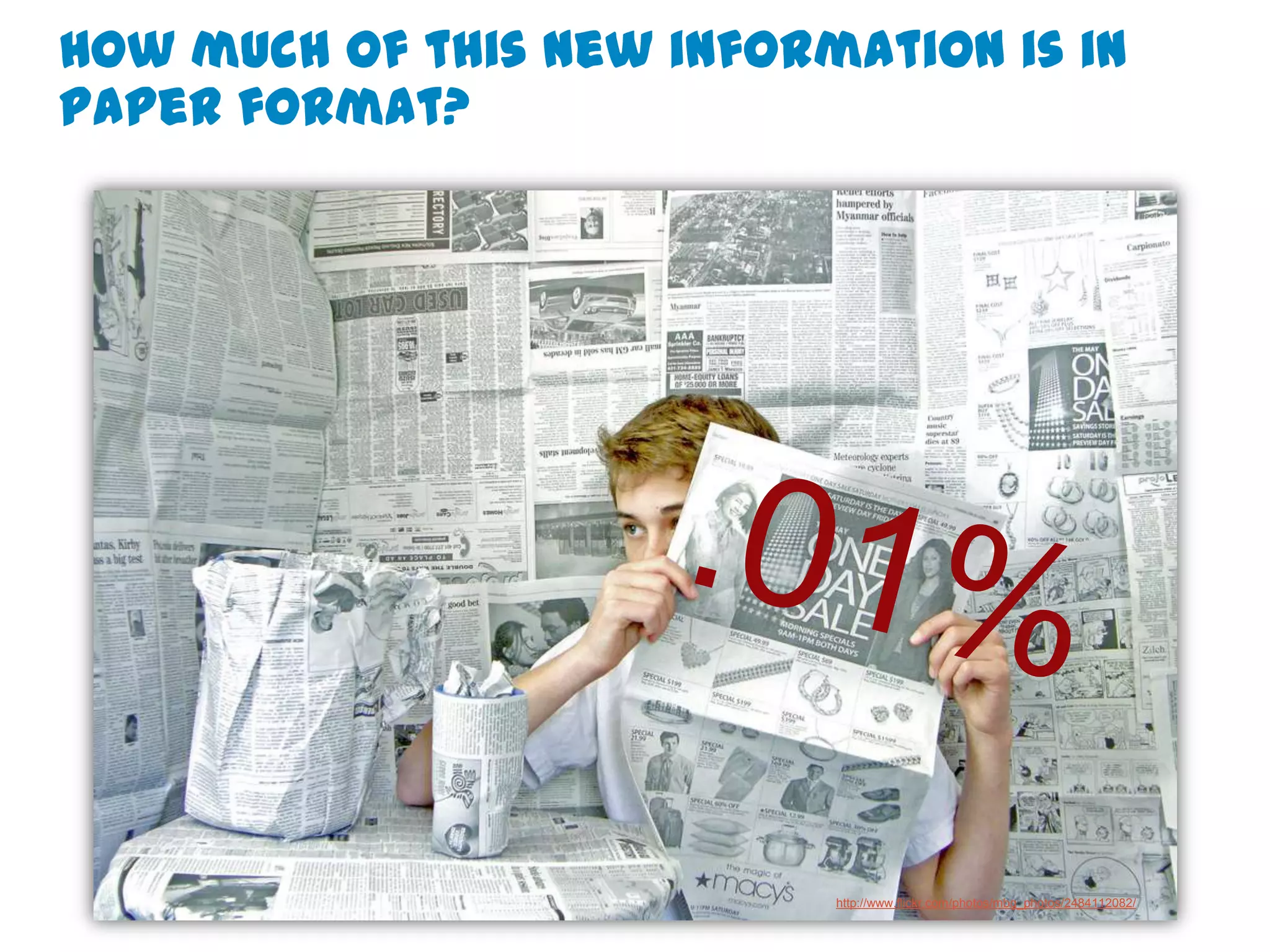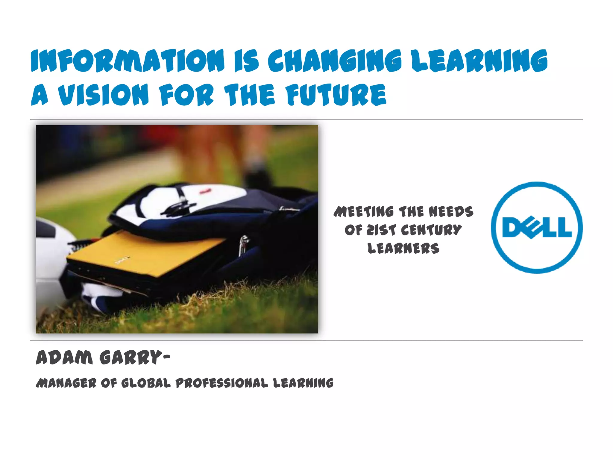 The document discusses 21st century learning and how information is changing education. It provides examples of how students today are constantly connected digitally and how much information is being created daily. It advocates that learning environments need to change to incorporate more technology, collaboration, and student-centered approaches to keep pace with evolving information needs. Key skills discussed include communication, critical thinking, creativity, and self-direction.