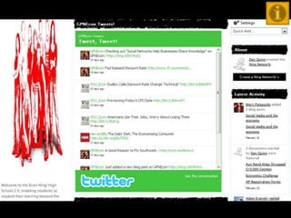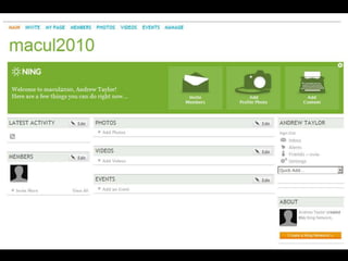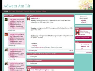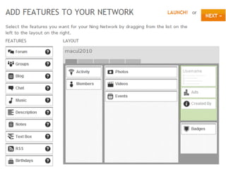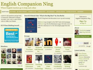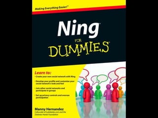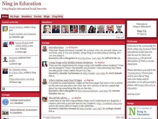 Ning is a social networking platform that allows educators to create private networks for students. It provides many of the collaborative features of Facebook but within a closed group that teachers control. Ning networks can be used as discussion forums, to share videos, photos and blogs. Unlike public social media sites, teachers manage the content and features on Ning to create a safer, more focused environment for classroom use. The document provides examples of how teachers have used Ning networks for communicating class notes, extending discussions beyond the classroom, and facilitating project-based learning among students.