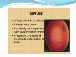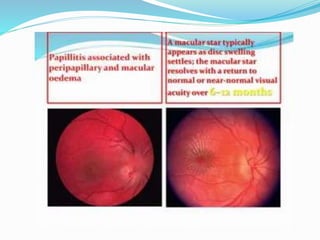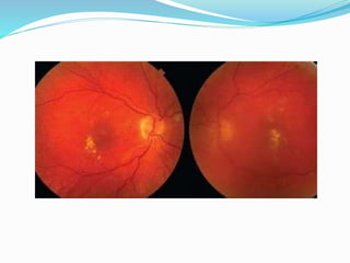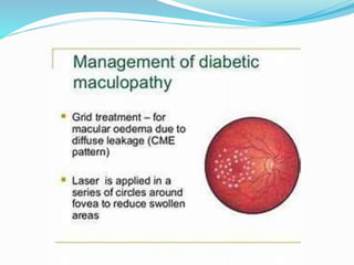 This document discusses macular edema, including its symptoms, causes, risk factors, diagnosis, and treatment. It notes that macular edema is often asymptomatic initially but can later cause blurred or wavy central vision and issues with color perception or reading. Common causes include diabetes, age-related macular degeneration, retinal vein occlusions, vitreomacular traction, inflammatory diseases, medications, eye tumors, trauma, and eye surgery. Diagnosis involves dilated eye exams, optical coherence tomography to measure macular thickness, and fluorescein angiography. Treatment focuses on the underlying cause and may include NSAIDs, steroids, anti-VEGF injections, laser treatment, or vitrectomy surgery.