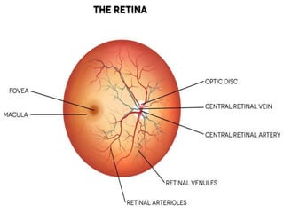 The document provides an extensive overview of the human retina, detailing its anatomy, thickness in various regions, and the structure and function of the macula and fovea. It covers symptoms of macular diseases, diagnostic tests to assess macular function and visual acuity, as well as various methodologies used in retinal imaging and evaluation. Additionally, it discusses the implications of different retinal conditions and the importance of testing for early detection and monitoring of visual impairments.